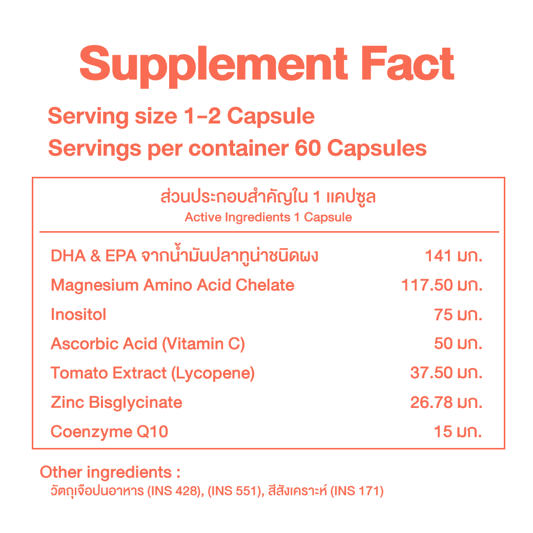 Inositol, Zinc, Vitamin C, E, D3, Folic Acid, CoQ10, Selenium, Vitamin B12, Chromium Picolinate และอื่น ๆ