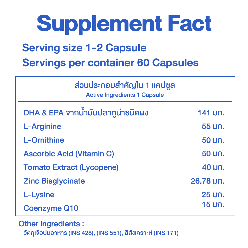 Lycopene, L-Arginine, Zinc, Vitamin C, Vitamin D3, Vitamin E, Folic Acid, CoQ10, Inositol และอื่น ๆ